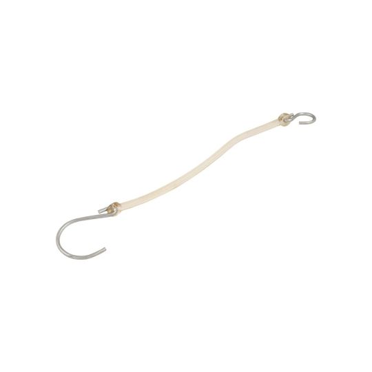 Een borghaak voor een klepsluiting. De borghaak is bevestigd aan een flexibele kunststofsnoer.