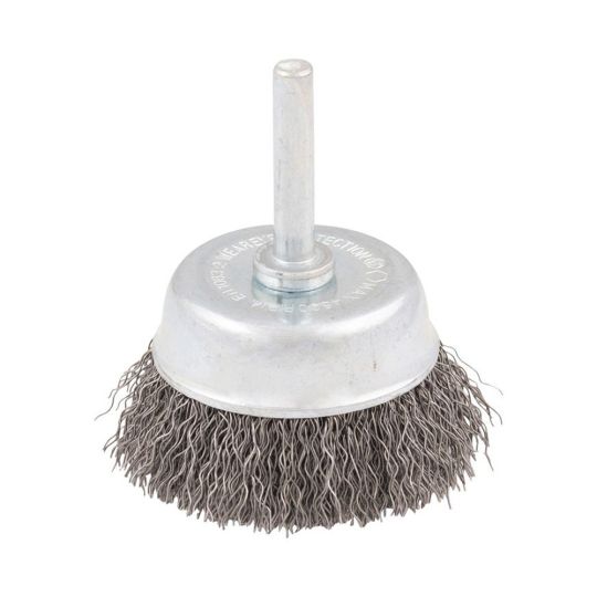 Een stalen komborstel met gegolfde staaldraad met 6 mm schacht voor gebruik op boormachines. Met hoge maximaal toegestane snelheid.