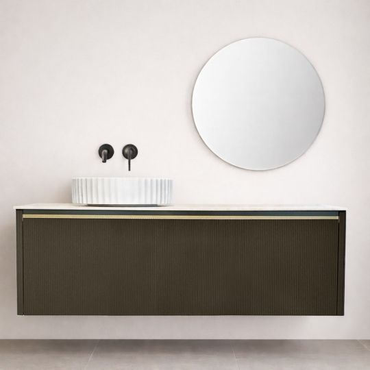 ✅ Greeploze wastafel onderkast 140 cm – 3D frontpaneel in grijsbruin met goudkleurige accent