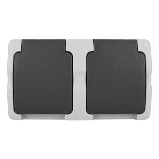 Een dubbel opbouw stopcontact met randaarde. Het stopcontact is spatwaterdicht door de deksels met veermechanisme.