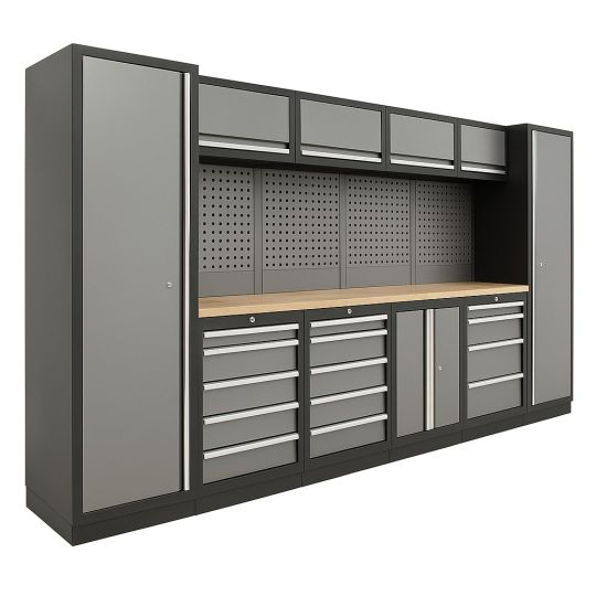 Transformeer uw garage tot een efficiënte en professionele werkruimte met deze complete werkplaatsinrichting. De set bestaat uit diverse opbergkasten, laden en een stevig werkblad, ideaal voor zowel de doe-het-zelver als de vakman.